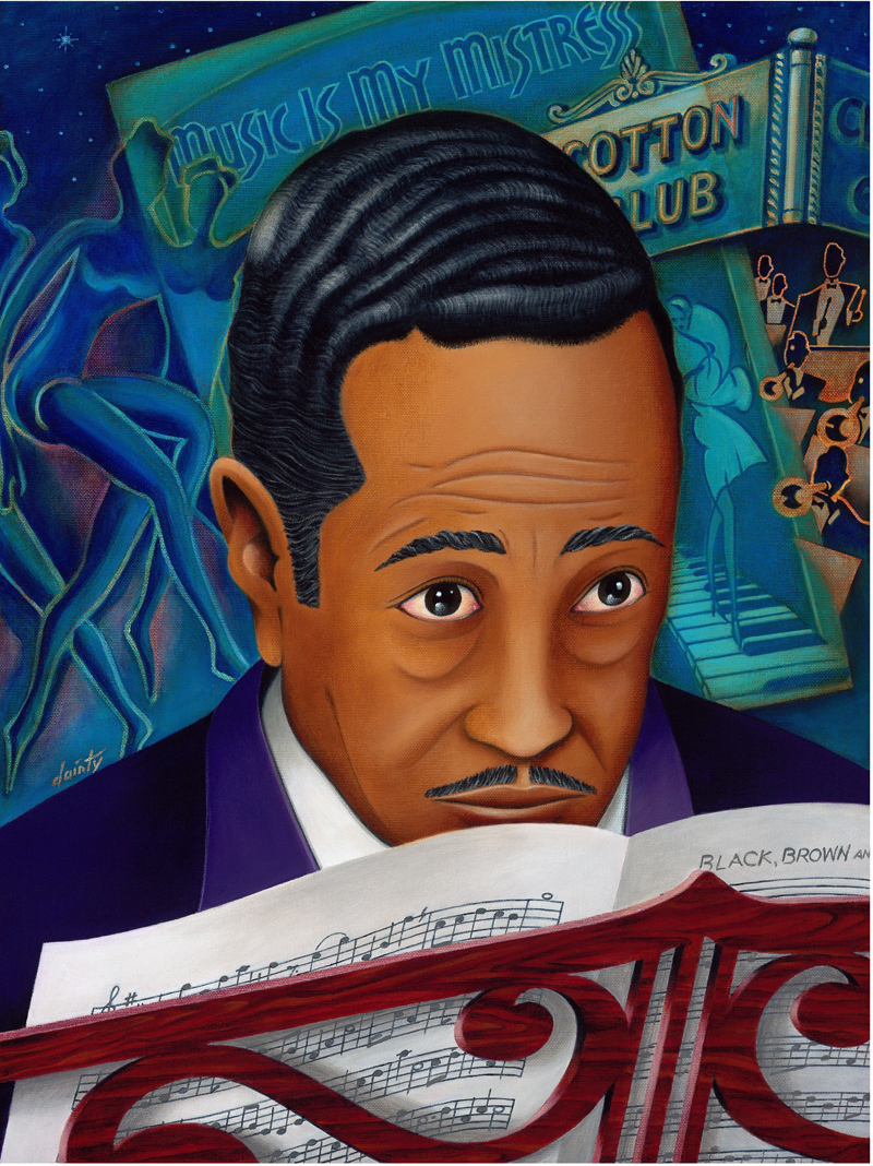 At the top on the right side is the sign from the famous Cotton Club in Harlem, and below that on the right border are stylized musicians that represent his orchestra. Their graphic look was taken from an old poster that advertised Duke Ellington at the Cotton Club performing Black and Tan Fantasy.